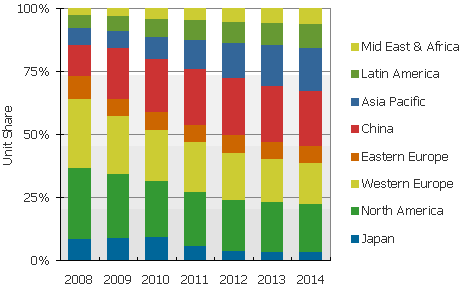 图一 2008年到2014年中国液晶电视在不同区域的发展状况