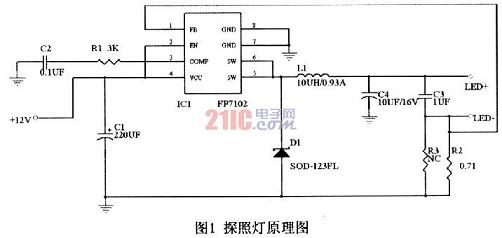 FP7102芯片设计的小型探照灯,所有元器件安放在1×2.7cm的板子上,制作完成后整个灯可以塞进直径为3cm的管子里,管子长度可以任意长。为了达到应用板小型化,在此设计中使用FP7102芯片作为LED的驱动芯片,电路可靠度高、元件使用精简、整体高效能运作,在应用上有很大的弹性空间,可满足各种功率LED需要。