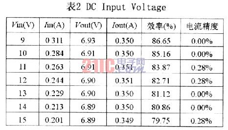 表2为输入用直流电源,电压范围9~15V,从表中可以看出Iout几乎不因输入电压不同而变动,效率为79.75~86.65%,电流精确度0.00~0.28%。(表2的数值是用1WLED量测)