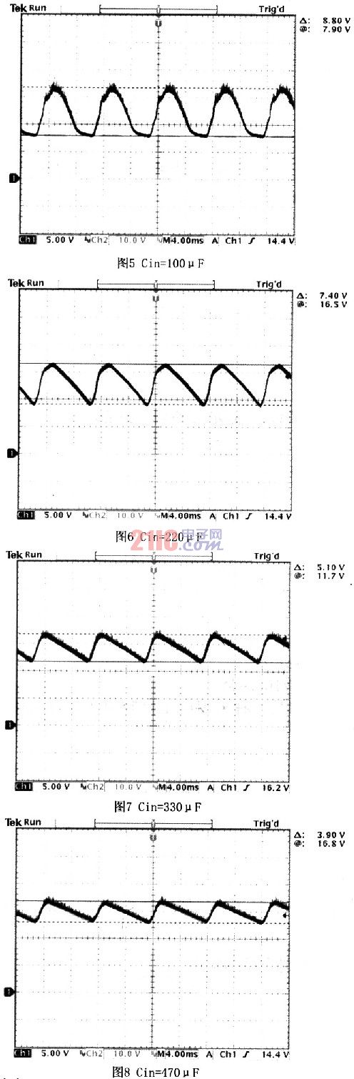 图5~图8列出了在不同输入电容值情况下,输入纹波Vin:CHl与SW:CH2的变化情形,输入电容值越大输入电压纹波越小,图5中因为纹波太大,造成Vin最小值刚好等于LED导通电压,这时候PWM全开,如果电容更小时LED导通电压不足,造成LED会无法发亮,图8中电容用330μF就能让输入电压不会过低。(串联3颗1WLED)