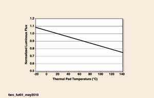 目前,市场上的一些高功率LED的热/冷因数为0.94。这意味着LED在100℃条件下工作时,将失去6%的标准光通。图2给出了典型和改进的热/冷因数下的光输出降低函数。