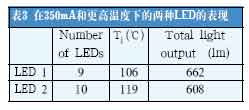 在数据表描述的25℃结温和350mA的前向电流下,LED2的性能比LED1要好。但是,更实际的比较将在更高的结温下进行(见表3)。