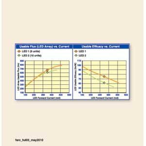 由于LED1的高热/冷因数,9个LED1的总光输出比10个LED2高出50lm。尽管在25℃时,LED1的额定光通低于LED2,但在350mA的电流驱动下,其性能要超过LED2。图3(左)显示了LED1在任何前向电流的驱动下,都比LED2高出100mA。图3(右)显示了在同样的电流驱动下,LED1的效能要高过LED2。