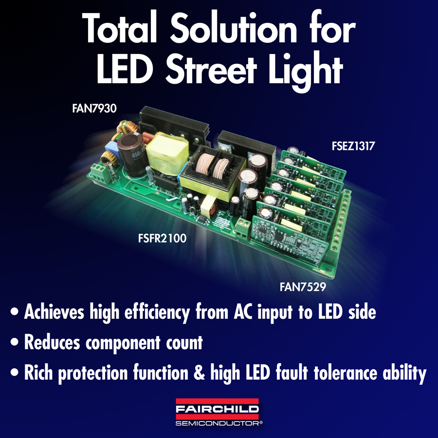 飞兆半导体公司( Fairchild Semiconductor) 位于中国的全球功率资源中心 (Global Power ResourceSM Center, GPRC) 开发出一款完整的LED路灯照明解决方案,具有高能效和出色的热性能,以及高可靠性,能够延长路灯的使用寿命。