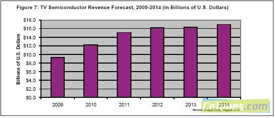 2009年电视半导体销售额高达93亿美元,由于液晶电视需要更多的半导体芯片支持各种高级功能,2010年销售额有望更上层楼。iSuppli公司的预测显示,2010年电视半导体市场将达到121亿美元。