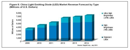 中国LED市场覆盖众多应用领域,包括LED显示器、街灯、普通照明、交通信号、手机键盘和数码相机闪光灯,以及大尺寸液晶电视、笔记本和其它显示器的背光。合计来看,中国液晶背光市场将强劲增长,2014年销售额将从2010年的4.68亿美元上升到12亿美元,复合年度增长率为25.7%。