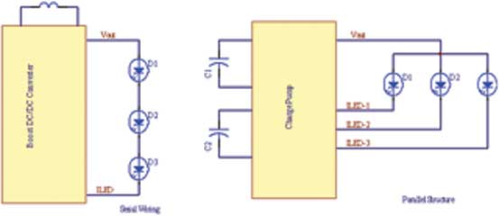 就这点而言,我们可以考虑采用串联或并联方式对LED进行连接:这两种连接方式各有其优缺点,见图2。