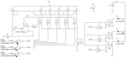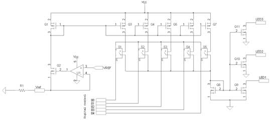 为了在LED中实现精确及稳定的正向偏置条件,通过与带隙参考提供的恒定电压相关的外部电阻产生一个参考电流。与运算放大器U1相关的晶体管Q1在Vref引脚产生恒定输出电压。Vref和地之间连接的外部电阻产生流经Q1和Q2的恒定电流。这个电流这时候就被Q3~Q7的晶体管系列建立镜像和放大,每个电流被连接至开关S1~S5,并且被晶体管Q8相加。最后,晶体管Q9复制参考电流至LED1。这种结构针对每个LED进行复制,而芯片的布局经仔细分析,以优化每个LED之间的匹配。