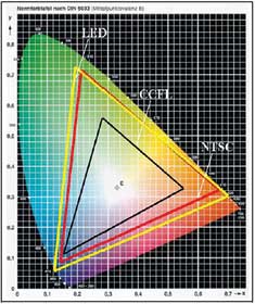 这样,每个LED都共用相同的I-LED峰值电流,而且需要额外的电子电路来对每个LED的亮度进行独立控制。这种功能通过为每个LED使用独立的PWM调制来实现(见图4):由数字信号PWM1至PWM3控制的开关S6~S8启动/关闭相关的电流镜,因此产生相关LED的亮度控制。其净优势是LED峰值电流恒定,确保了色彩表现不会被亮度控制所减弱,LED的工作点保持在色彩地图所定义的参考色彩,见图5。