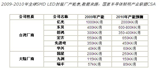台湾封装第一大厂亿光2010年LED TV背光源出货大幅放量,已接到LG、三星、瑞轩等大厂订单,初步规划,SMD月产能将从10亿颗倍增至20亿颗。另一大厂东贝目前SMD月产能为4亿颗,2010年也是锁定扩充大尺寸背光用SMD封装产能,SMD月产能将达到6亿颗至8亿颗,而宏齐以及佰鸿也都有扩产计划。2010年台厂SMD产能成长至少5成至1倍。