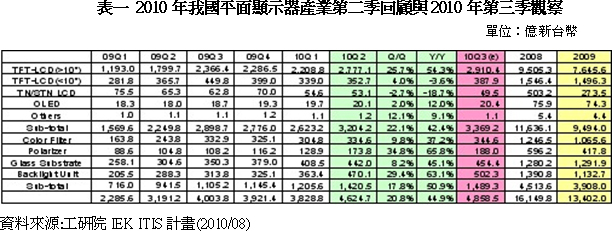 大型TFT LCD面板产业方面,2010年第二季台湾大型TFT LCD产值虽进入传统淡季,由于终端拉货意愿仍高,因此在面板出货上仍维持着淡季不淡的荣景,产值达到新台币2,777.1亿元,较第一季成长了25.7%。分析各业者出货结构,4-6月份NB、监视器以及TV面板出货均呈现稳定成长之态势,其中IT用面板(含NB、监视器面板)出货幅度反应了第三季的开学潮需求。再以面板报价解析,由于第一季各类型面板涨势过猛,使得终端业者在第二季面板价格的态度渐趋保守,大型面板报价呈现成长停滞乃至于缓步下跌的现象,平均以每个月3-5美元不等的价格走低,连带也影响产值表现。在中小型TFT LCD面板方面,2010年第二季与因为智慧型手机(Smartphone)藉由低价化而在手机市场渗透率提升相当快,此类面板需求相对较佳,刺激手机面板平均尺寸成长以及高阶规格化,台厂中小尺寸TFT LCD产值较2010年第一季成长4%。 OLED面板产业方面,在PMOLED的部分,第二季出货呈现稳定成长的趋势,而AMOLED面板的部分则仍以台湾的奇晶光电为主,友达光电在AMOLED面板正式出货效预估延至2011年才能看出明显产出贡献,总计PMOLED与AMOLED产值在第二季达到20.1亿新台币。在TN/STN产业方面,2010年第二季TN/STN面板产值达53.1亿新台币,相较于上季产值减少近2.7%,原因是中小尺寸的TFT LCD面板取代效应仍然持续进行,另外, AMOLED也在崛起中,而目标市场就是手持式消费性电子产品,同时威胁着TN/STN与TFT LCD面板。