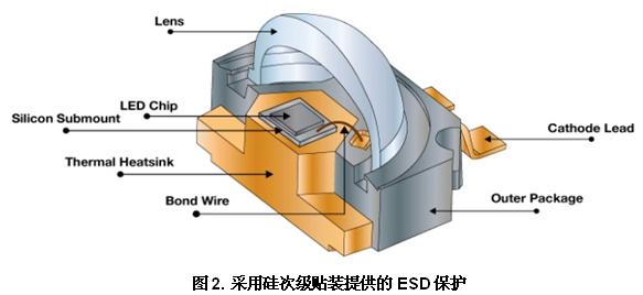 图2显示了如何在LED和引线框之间应用硅次级贴装来更紧密地集成ESD?;?。这种构造使LED外形尺寸更紧凑;次级贴装替代侧面贴装LED??橹惺褂玫拇吵牡祝峁┑腅SD?;さ燃冻?5 kV HBM。硅次级贴装的良好热传导性也帮助LED缓解由于LED与引线框热膨胀系数不同导致的应力。