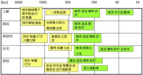 (2)一般照明--办公室、教室、量贩店、一般店面、咖啡店、快餐馆、工厂、生产线,则要有300-800Lux。