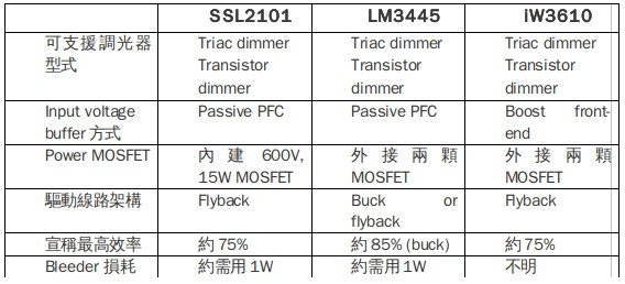 表二、市面上可见的TriacDimmableLEDLightingDriverIC