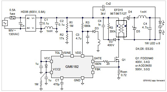 图一GM6182高功因、高效率、具有EZDimming功能的LED驱动器