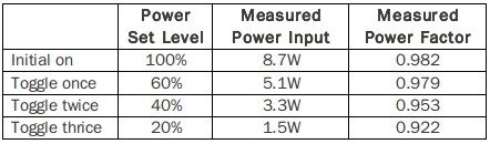 EZdimming侦测wallswitch切换次数,来改变调光准位。自全亮开始,循序降到六分亮,四分亮,二分亮。并且在任何调光阶段,都维持高于0.90的功因、高于80%的效率。切换柔和,完全没有突波电流或噪音的现象。线路精简,几乎是零增加硬体成本。