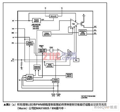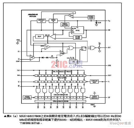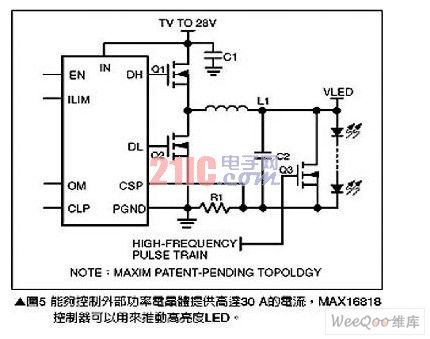 对于需要高照明功率,例如照明灯或雾灯等应用就必须使用多个高亮度LED(HighBrightLED;HBLED),但是高亮度LED却需要超高驱动电流,要产生所需的电流会使用太多的驱动芯片,因此较简单的解决方案是使用可以推动高电流晶体管的控制器,为高亮度LED提供高达30A的电流,这类组件的一个范例为MAX16818,请参考图5。