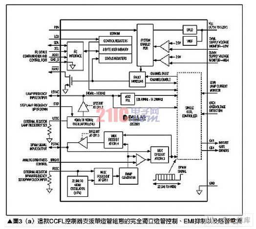 传统上LCD面板使用CCFL灯管作为背光源,主要是这项技术拥有良好效率、低温以及高照明能力等优势,虽然CCFL控制器在非汽车类应用中,例如液晶电视或液晶显示器上相当成功,但汽车的工作环境却对这项技术带来特殊的挑战与要求,为了让元件数减少,CCFL控制器必须包含包括如EMI抑制、灯管电流过度驱动(overdrive)能力,以及将接脚数降到最低的串行控制接口、各信道灯管失效监测、灯管频率与DPWM控制用精确内建振荡电路以及其它功能等,这类解决方案有美信(Maxim)公司的DS3881,请参考图3(a),其只需少许的外加电路,就能够组合出完整的CCFL电源控制子系统,请参考图3(b)。DS3881主要针对汽车应用环境进行最佳化设计,由于所采用的基础电路组态,因此外部晶体管、变压器以及灯管本身就形成了EMI的噪声来源,DS3881通过使用展频与频率偏移技术来降低EMI发射,并将任何未移除噪声移到非关键频带来解决这个问题。