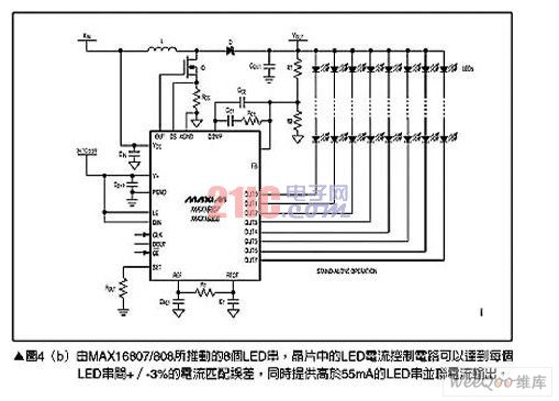 对于较小型的显示面板,就可以使用LED矩阵来取代CCFL背光,不过使用多个LED串也会带来相对的设计挑战,其中最明显的是如何能够在整个区域提供一致的照明与色彩输出。推动LED背光矩阵的一个方式是采用内含8个LED驱动通道,分别可以提供55mA电流输出的MAX16807与MAX16808,请参考图4(a),图4(b)则显示了采用MAX16807的典型电路如何简化系统,只需少数几个元件就能够完成背光驱动子系统的设计。