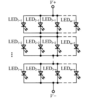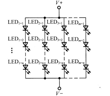 若干个LED先并后串的混联形式如图6所示。由于LED1-n~LEDm-n先并联连接,提高了每组LED故障下的可靠性,但是由此一来每组并联LED的均流问题就至关重要。为此,可以通过配对挑选,将工作电压和电流尽量相同的LED作为并联的一组,或者给每个LED串接小的均流电阻来解决。这种混联形式具有的其他特点和存在的问题,与先串后并连接形式相类似。