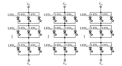 交叉阵列形式主要是为了提高LED工作的可靠性,降低故障率。主要构成形式是:每串以3个LED为一组,分别接入驱动器输出的Va、Vb、Vc输出端。当一串中的3个LED都正常时,3个LED同时发光;一旦其中一个或两个LED失效开路时,可以保证至少有一个LED正常工作。这样一来就能够大大地提高每组LED发光的可靠性,也就能够提高整个LED发光的总体可靠性。