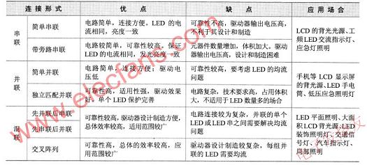 不同的连接形式具有各自不同的特点,并且对驱动器的要求也不相同,特别是在单个LED发生故障时电路工作的情况、整体发光的可靠性、保证整体LED尽量能够继续工作的能力、减少总体LED的失效率等就显得尤为重要。表1给出了采用不同连接形式时的相关情况的比较。