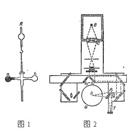 列别捷夫所用仪器的主要部分是一用细线悬挂起来的极轻的悬体R,其上固定有小翼a及b,如图1示,其中一个涂黑,另一个是光亮的。将悬体R置于如图2所示的真空容器G内。借助透镜及平面镜系统将由弧光灯B发出的光线射向小翼中的一个。由于作用在小翼上的光压力,使悬体R转动。转动的大小,可借助望远镜及固定在轴线上的小镜观察到。移动双镜能使光射在涂黑的小翼上。比较两种情况下悬体转动的大小,列别捷夫测得,涂黑表面所受的光压力比反射表面所受的光压力小一半,与理论完全符合。