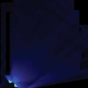 对于图3中的例子,所用的是两个侧面发光高亮度LED器件,并使用经过优化的边缘光源导光体进行光耦合。之后,为了确定系统中的自然光谱进行了基线光学建模。建模完成后,一个经过定制的光学透镜阵列被增加进来,以改善从LED器件发出的可以利用的光,并且将光的出射范围扩展到比LED器件制造商原始设计更广的地步。