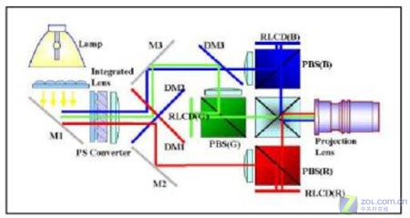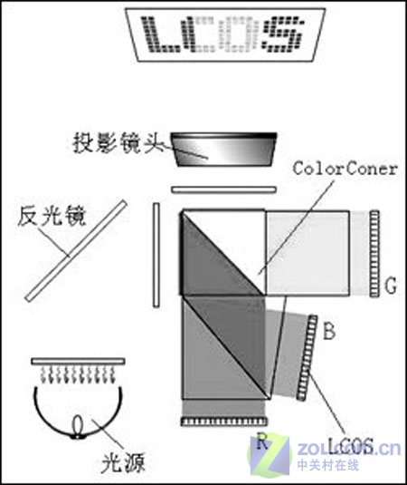 投影机技术基本显影原理相仿,主要是由卤素灯、氙气灯等发光,集光至面板,将面板的影像经反射或透射投射出影像,再经过分光、合光系统,最后将影像投射到屏幕显像。LCOS(LiquidCrystalonSilicon)是一种全新的数码成像技术,它采用半导体CMOS集成电路芯片作为反射式LCD的基片,CMOS芯片上涂有薄薄的一层液晶硅,控制电路置于显示装置的后面,可以提高透光率,从而实现更大的光输出和更高的分辨率。