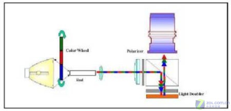 单片式ColorWheel光学引擎则是以快速旋转的ColorSwitch将白光形成循序的红、蓝、绿光,并将三原色光与驱动程式产生的红、蓝、绿画面,同步形成分色影像,再藉由人眼视觉暂留的特性,最后在人脑产生彩色的投影画面。类似的技术有:Displaytech发表的FieldSequentialColor、Philip所采用的ScrollingColor-RotatingPrism架构、及JVC采用的SpatialColor–Hologram架构。[page]