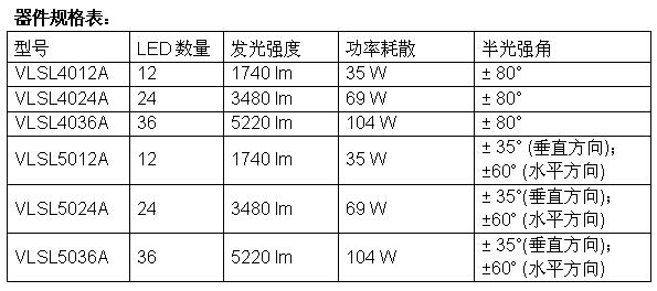 每个模块皆配有12、24或36个高亮度LED,VLSL40xxA采用VLSL-REFL01反射镜调整发光特性,而VLSL50xxA的发光呈蝶型。