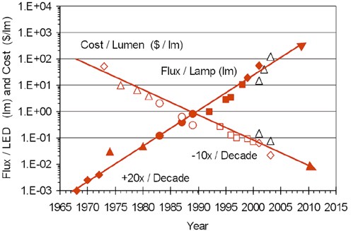 上述的讲法听来有些让人疑惑,今日不是一直强调LED的亮度突破吗?2003年LumiledsLighting公司RolandHaitz先生依据过去的观察所理出的一个经验性技术推论定律,从1965年第一个商业化的LED开始算,在这30多年的发展中,LED约每18个月;24个月可提升一倍的亮度,而在往后的10年内,预计亮度可以再提升20倍,而成本将降至现有的1/10,此也是近年来开始盛行的Haitz定律,且被认为是LED界的Moore(摩尔)定律。