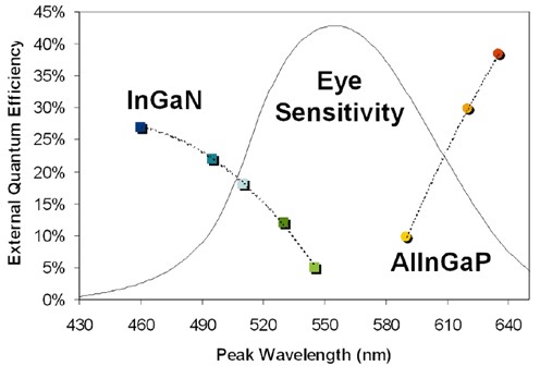 图中为InGaN与AlInGaP两种LED用的半导体材料,在各尖峰波长(光色)下的外部量子化效率图,虽然最理想下可逼近40%,但若再将光取效率列入考虑,实际上都在15%;25%间,何况两种材料在更高效率的部分都不在人眼感受性的范畴内,范畴之下的仅有20%。