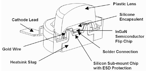从Lumileds公司Luxeon系列LED的横切面可以得知,硅封胶固定住LED裸晶与裸晶上的荧光质(若有用上荧光质的话),然后封胶之上才有透镜,而裸晶下方用焊接(或导热膏)与硅子镶嵌芯片(SiliconSub-mountChip)连接,此芯片也可强化ESD静电防护性,往下再连接散热块,部分LED也直接裸晶底部与散热块相连。