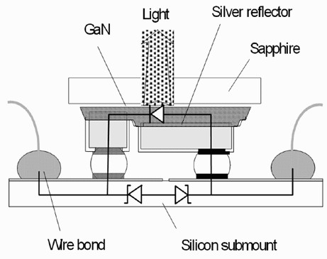 Lumileds公司Luxeon系列LED的裸晶实行覆晶镶嵌法,因此其蓝宝石基板变成在上端,同时还加入一层银质作为光反射层,进而增加光取出量,此外也在SiliconSubmount内制出两个基纳二极管(ZenerDiode),使LED获得稳压效果,使运作表现更稳定。
