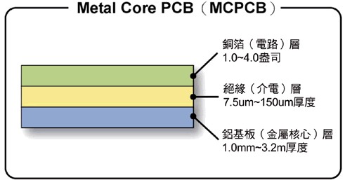 为了强化LED的散热,过去的FR4印刷电路板已不敷应付,因此提出了内具金属核心的印刷电路板,称为MCPCB,运用更底部的铝或铜等热传导性较佳的金属来加速散热,不过也因绝缘层的特性使其热传导受到若干限制。(制图:郭长佑)