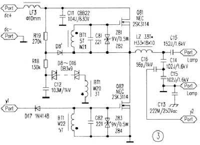 逆变器的振荡频率由绕组W21、W22的电感量与场效应管Q81、Q82的输入电容以及补偿电容C81、C82共同决定,灯回路网络的谐振频率必须与输入回路的谐振频率相同,例如:谐振频率为2.65MHz?;挂×τ呕疩81、Q82驱动信号的幅度和波形,使其自身功耗降到最低。