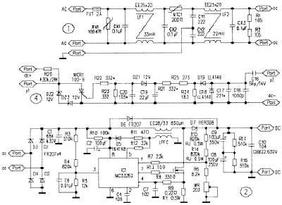 MC33262是一款可靠且成本低廉的功率因数校正芯片,其应用电路如图2所示。市电经电源滤波器和整流器得到脉动直流电。电流通过启动电阻R10向C2充电至10V时,IC1开始工作。整流后的直流脉动电压在R5的分压作为取样信号经IC1的③脚输入乘法器。
