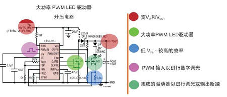 在高电流情况下驱动LED要求有一个DC/DC控制器,以精确地调整电流,确保一致的光密度和颜色的统一性,并保护LED。此外,一个巨大的挑战是利用电池电压为一或几串LED供电,电池电压可以小于、等于或大于其负载电压。另一个考虑是要有效地对大调光比率的LED进行调光,同时维持其在低和高亮度水平上的色彩特性。此外,DC/DC驱动器的有效运行是一个关键因素,特别是在驱动高亮度LED时,因为所有没有用来照明的功率将成为热损耗。
