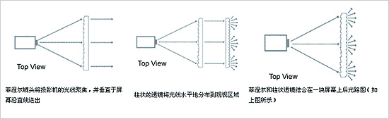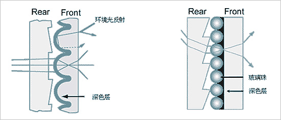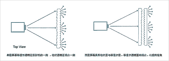 (UCS/RUCS屏幕)在两层透镜之间的光学镜头表面覆盖了一层黑色素层,可吸收环境光,柱状的镜头能拾取投影机的光线,并传送到观视者,而前面的环境光则会被吸收。