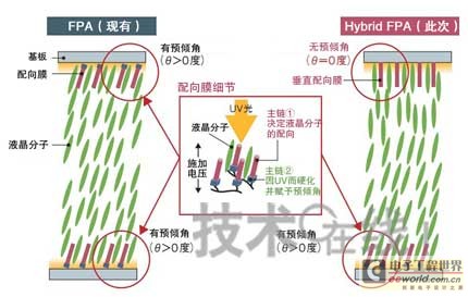 此次开发的Hybrid FPA仅在夹有液晶的一侧基板上使用了赋予预倾角的配向膜。据称,由此与两侧均配备赋予了预倾角的配向膜的原FPA相比,电压关闭时液晶分子的响应速度要快(图1)。而且,在未赋予预倾角的基板一侧,液晶分子几乎全部沿垂直方向配置,因此可减少漏光。由此比现有的FPA还提高了对比度。