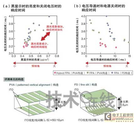 Hybrid FPA试制单元,其电压关闭时的液晶分子响应时间和黑显示时的亮度与已有FPA的试制单元相比,均得到了改善(a)。而电源导通时的响应速度稍慢于FPA(b)。(图根据索尼的资料制作)[page]
