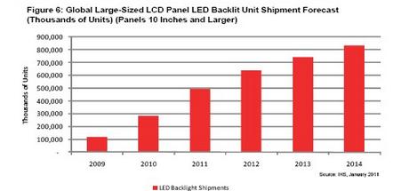 据IHS iSuppli公司预测,2011年全球出货的三分之二以上大尺寸液晶面板将采用LED背光,该比例2010年低于50%。预计2011年将有67%的大尺寸液晶面板采用LED背光,高于2010年的44%。2011年LED背光大尺寸液晶面板出货量将达到4.956亿块,比2010年的2.833亿块大增74.9%。
