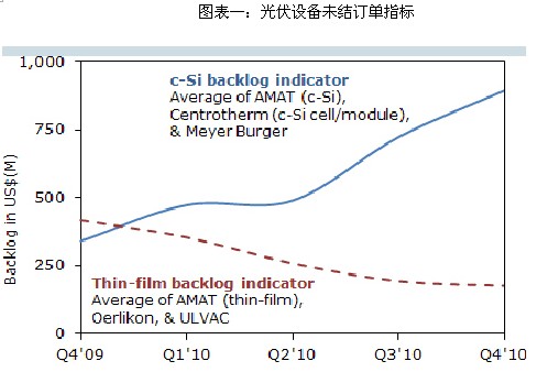随着2011年所公布的超越60%年度增长率的产能的扩张,首选设备供应商的订单使得未结订单总量创下新记录,超过了2008年由高价格交钥匙薄膜生产线业务推动的水平。2010年第四季度末,有20家设备供应商的订单积累已经超过了1亿美金,这些订单主要的出货时间集中在2011年上半年。目前的未结订单总量与2009年第四季度相比有26%的增长,导致2010年的订单出货比原高于上一年水平(1.24),其中2010年第二季度的更是创下了1.7的八季高点。