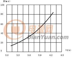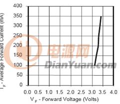假如用干电池或蓄电池供电,那么因为LED伏安特性的非线性,很小的电压变化就会引起很大的电流变化,上图中电源电压在3.3V时正向电流为20mA的LED,如果用3节干电池供电,新的电池电压超过1.5V,3节就是4.5V,LED的电流就会超过100mA,很快就会烧坏。对于1W的大功率LED也是如此,图2是某公司1W的LED伏安特性,而一个12V蓄电池的电压,在充满电到快放完电的电压可以从14.5V降到10.5V。相差将近20%。从伏安特性上可以看出,电源电压的10%的变化(3.4V-3.1V),就会引起正向电流的3.5倍的变化(从350mA变到100mA)。
