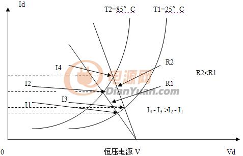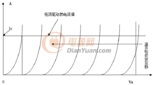 温升以后,N个伏安特性都左移,就使电流的增加也加大了N倍。如果采用恒流电源供电,那么温升以后,仍然能够保持电流恒定为Io。