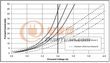 由于LED伏安特性的离散性,不但不同厂家生产的同样瓦数的LED伏安特性不一样,就是同一厂家生产的同一型号的LED其伏安特性也是不同的。