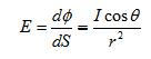 照度(Luminosity)指物体被照亮的程度,采用单位面积所接受的光通量来表示,表示单位为勒[克斯](Lux),即lm/m2。1勒[克斯]等于1流[明](lm)的光通量均匀分布于1m2面积上的光照度。LED阵列的照度是多个单个LED照度的线性叠加。因此只分析单个LED照度。通常LED所照射的目标距离比LED本身大的多,在这种情况下将LED发光管简化为一个有一定空间光强分布的点光源。点光源的特点是能以4立体角向周围空间发出相同发光强度的光辐射。假设面元dS接受LED点光源S的光照,设点光源S至面元dS的距离为r,并且点光源发出的元光束的光轴与面元的法线N之间的夹角为,则面元上的照度为: