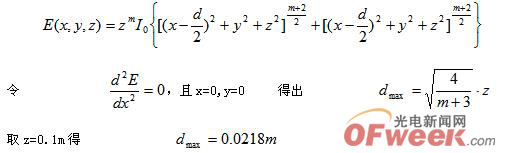 d增加到0.0218时,原点附近的区域的光照度不至下降很多,此距离比较合适。通过仿真可以验证计算结果,如图1所示,当d=0.0218m时,原点附近照度较均匀。 [page]
