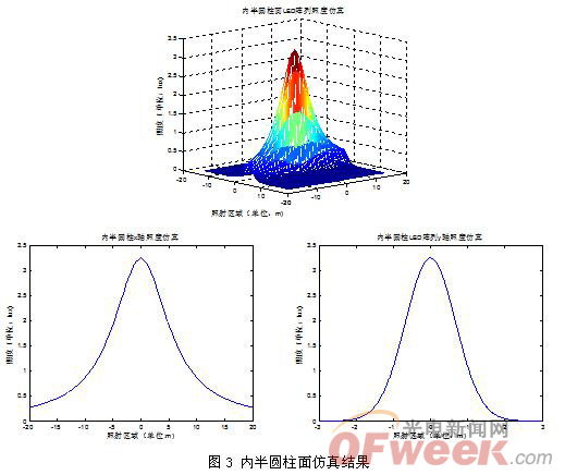 对于以上分析的两种阵列,所用LED及数目均相同,但是根据仿真结果我们可以看出,在照度大小、照射区域等方面存在很大的区别。代表平面的矩形分布的阵列中心照度比较大,达到了40Lux,但是其照射区域比较小,20Lux内仅有约0.75m的范围内,而代表曲面的内半圆柱表面分布的阵列中心照度比较小,仅为3.3Lux,但照射区域比较大,最大照度值一半的区域在一方向上达到了7m。